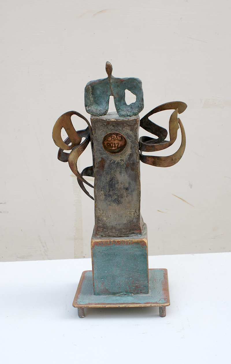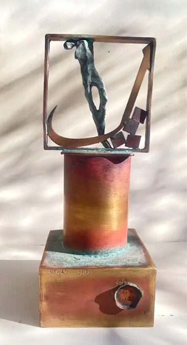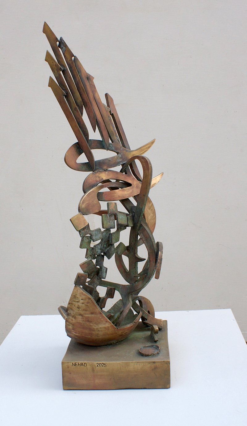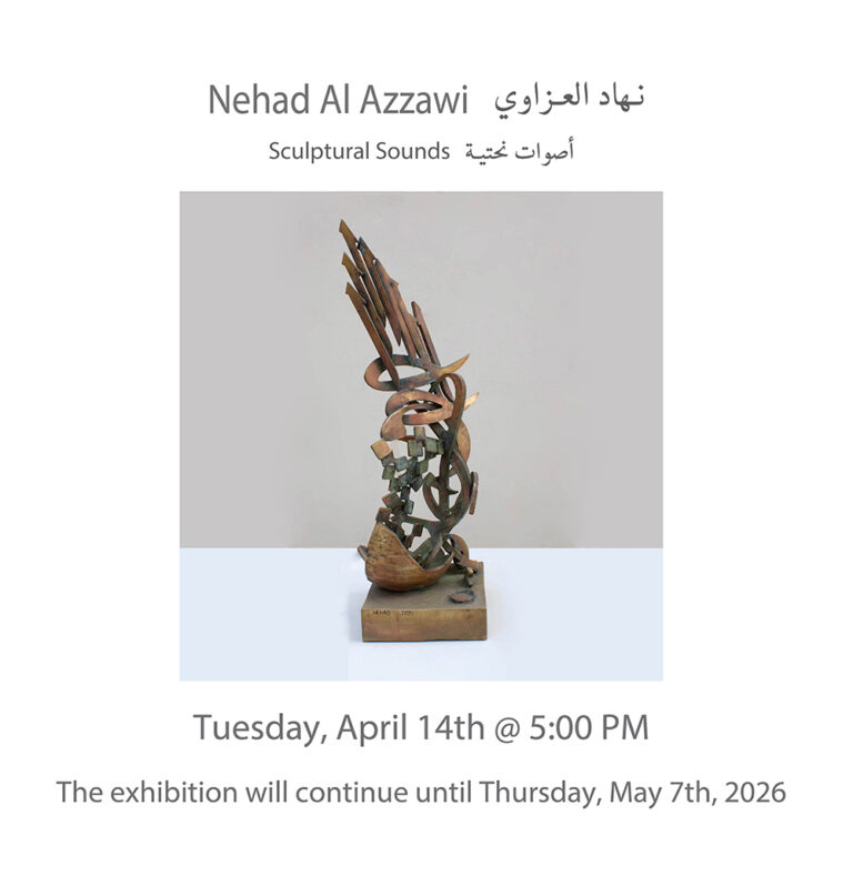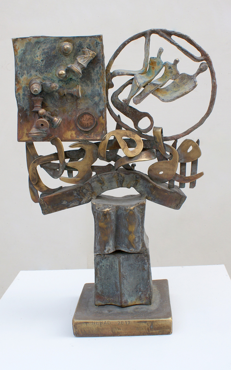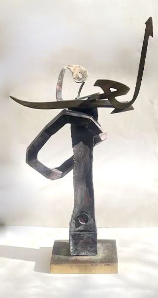 Sculptural Sounds The presence of the Arabic letter as a common denominator in all the sculptures appears as though it were an element parallel to the figures (the present – the absent). At times, it is presented as a fundamental component of the artwork, and at other times it functions as a symbol of something beyond itself. Here, the visual scene operates through the alphabet of the letter and its symbolic connotations. The harmony between the letter (sound – form) and these symbols, which parallel its pronunciation, acts as a complement in enriching the subject and leading it into the realm of symbols (semiology). Nehad Al Azzawi