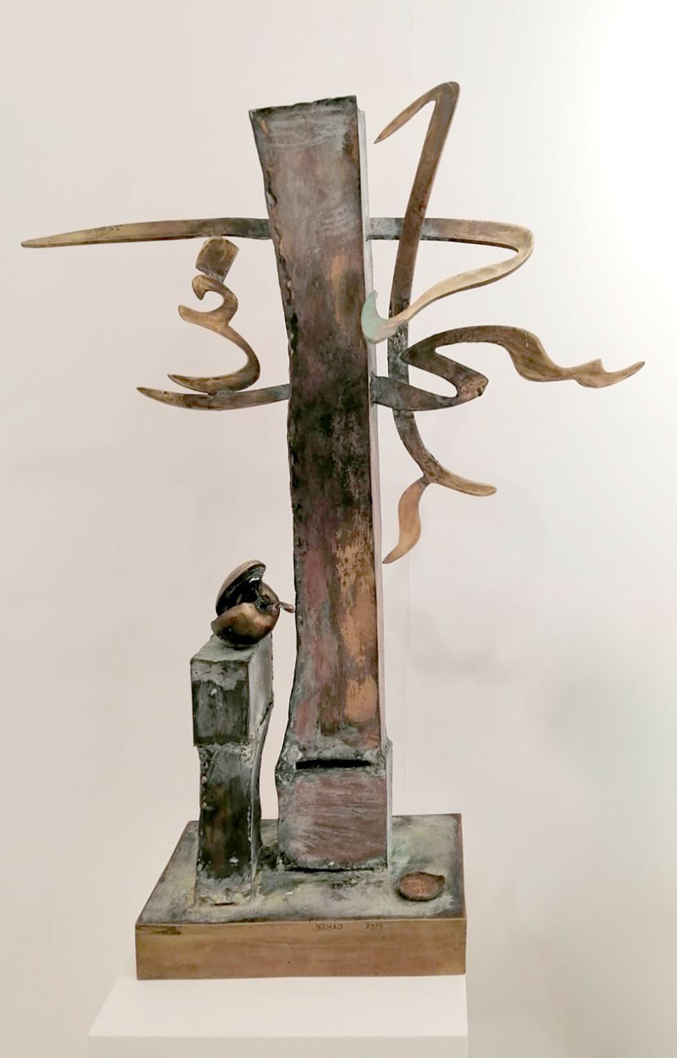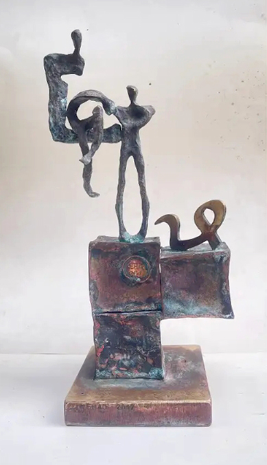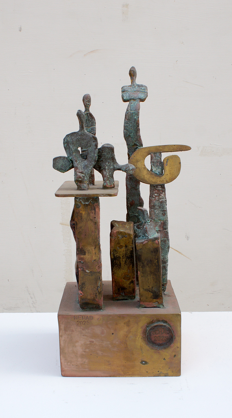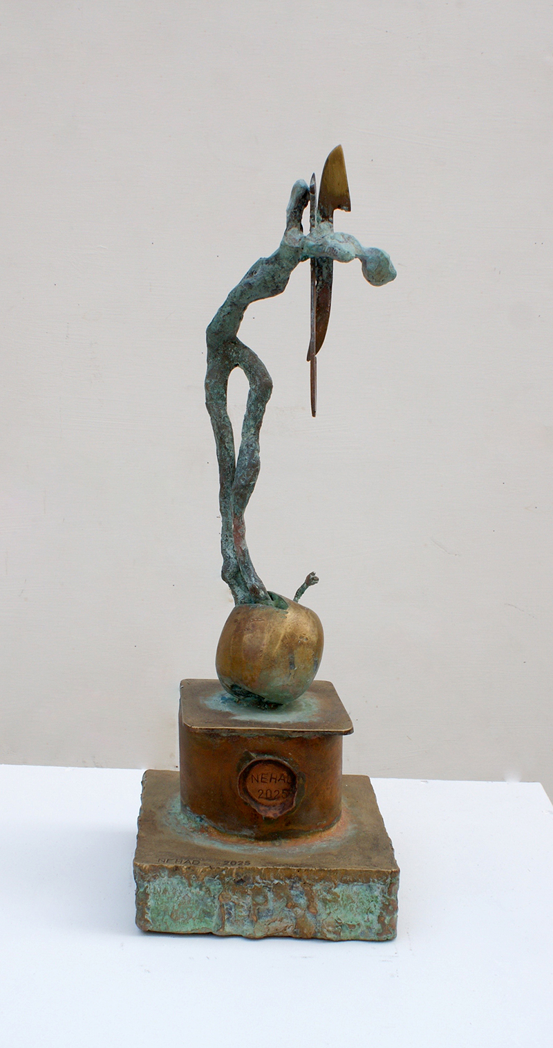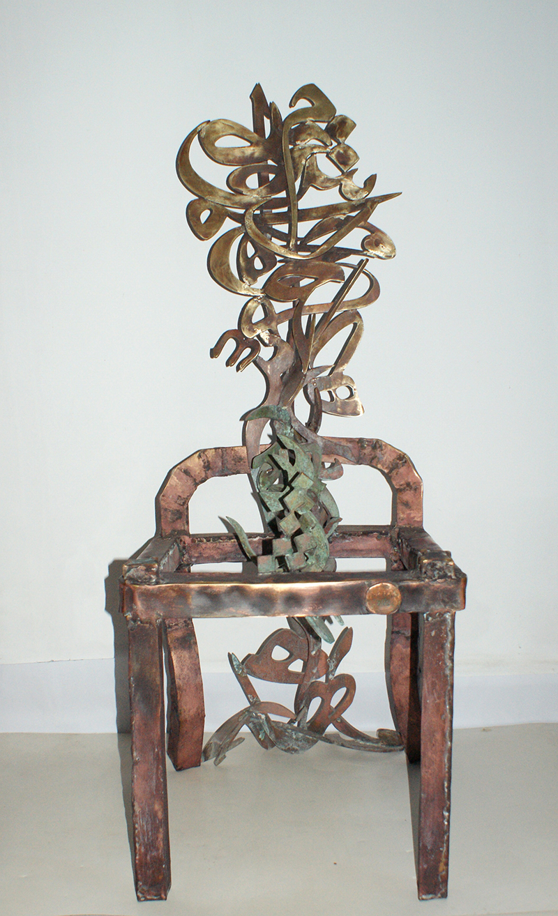 Sculptural Sounds The presence of the Arabic letter as a common denominator in all the sculptures appears as though it were an element parallel to the figures (the present – the absent). At times, it is presented as a fundamental component of the artwork, and at other times it functions as a symbol of something beyond itself. Here, the visual scene operates through the alphabet of the letter and its symbolic connotations. The harmony between the letter (sound – form) and these symbols, which parallel its pronunciation, acts as a complement in enriching the subject and leading it into the realm of symbols (semiology). Nehad Al Azzawi